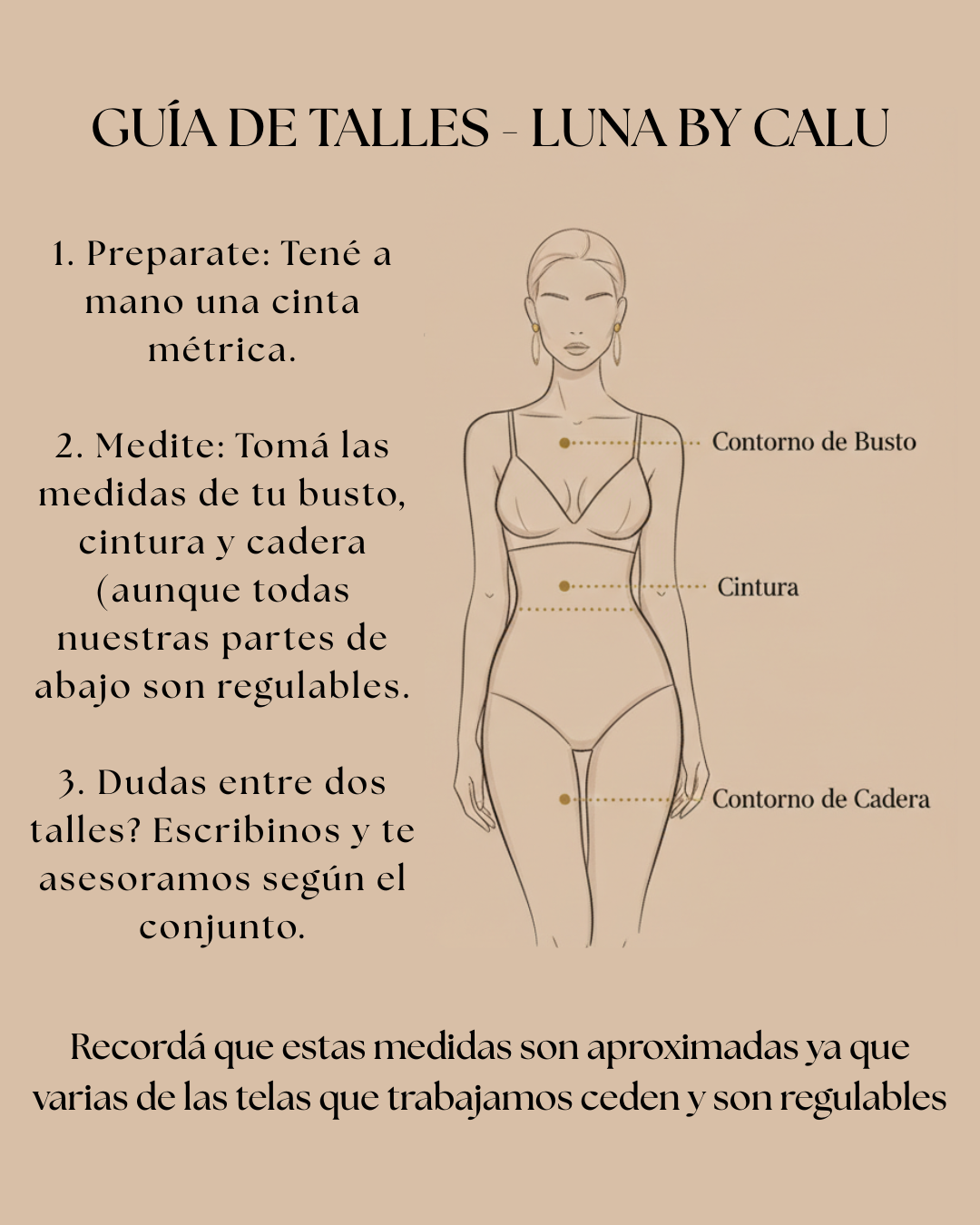 Nuestras tablas de talles son una guía de referencia: recordá que el calce final puede variar dependiendo del diseño y la elasticidad de cada textil. Si estás entre dos talles y no sabés cuál elegir, escribinos por WhatsApp ¡Estamos para asesorarte y que tu prenda de Luna by Calu te quede perfecta!
